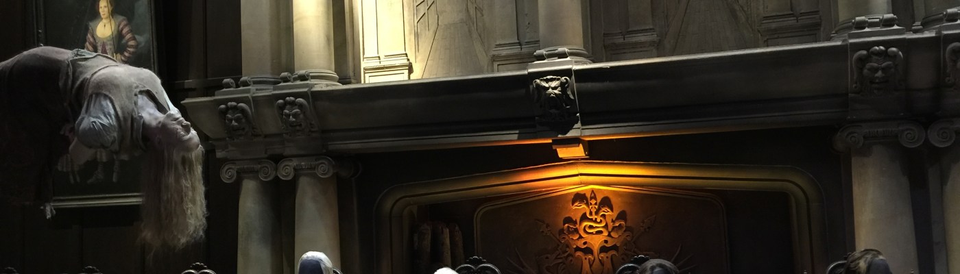 The image heading this post depicts the set of the “Death Eaters” which is now part of the Warner Studios Making of Harry Potter tour. I can’t be sure, but I think even the faceless Slitheren purebloods are mourning the loss of this portrayer of villainous, heroic, Snape.